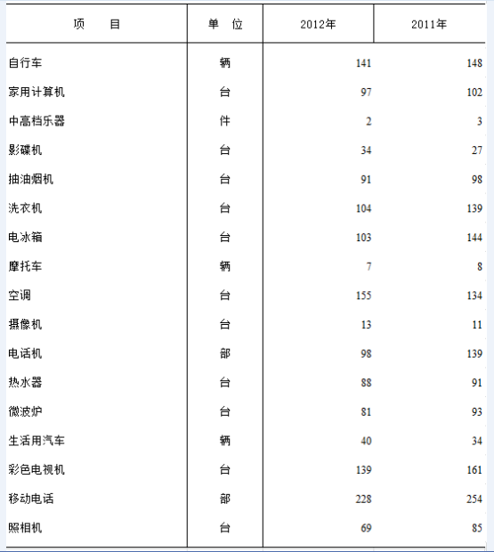 180户农村居民家庭每百户主要耐用消费品拥有量