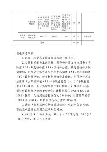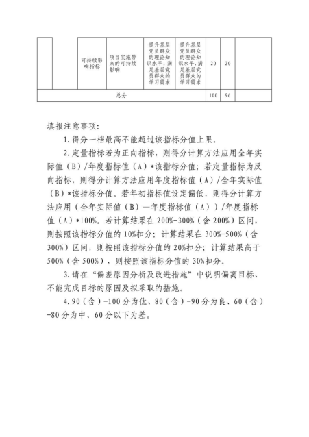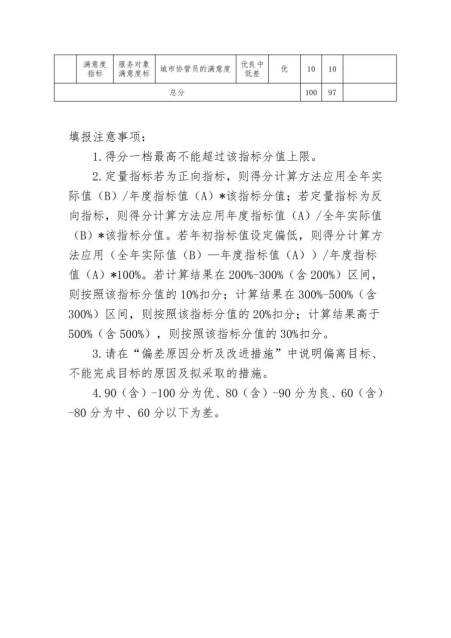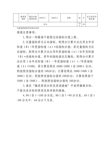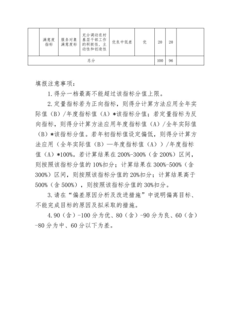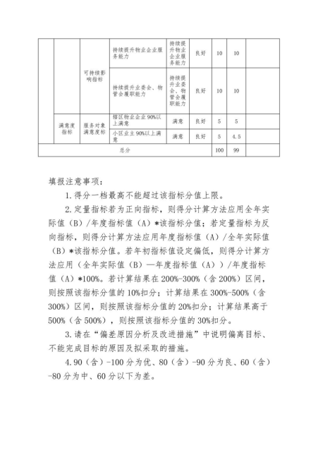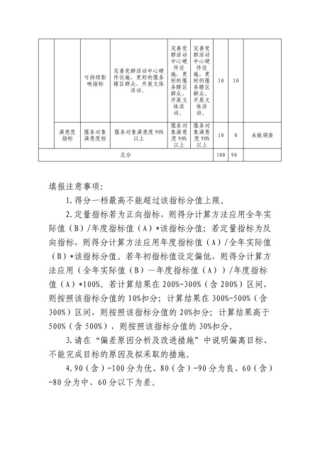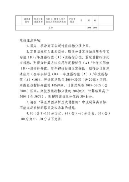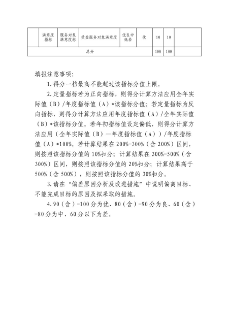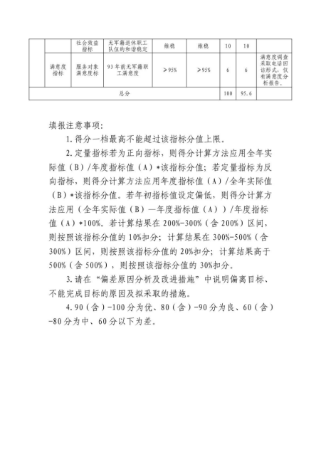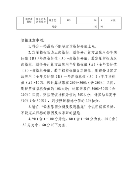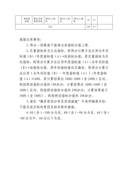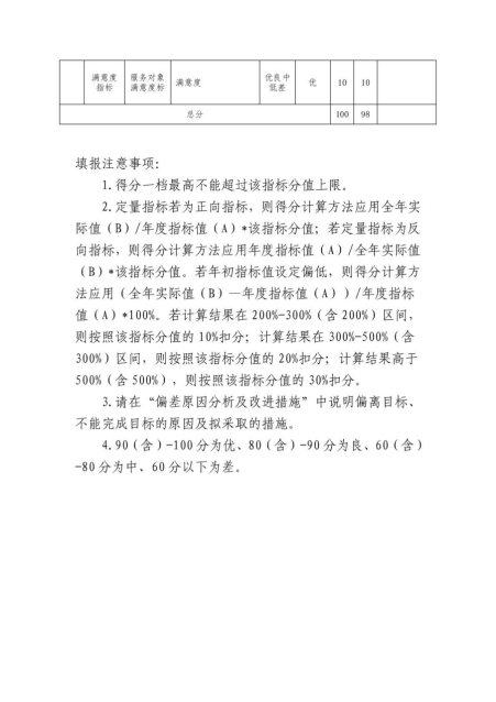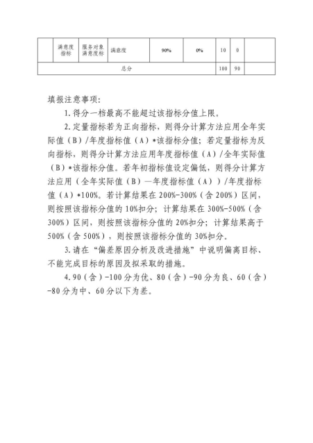 2.定量指标若为正向指标,则得分计算方法应用全年实际值(B)/年度指标值(A)*该指标分值;若定量指标为反向指标,则得分计算方法应用年度指标值(A)/全年实际值(B)*该指标分值。若年初指标值设定偏低,则得分计算方法应用(全年实际值(B)—年度指标值(A))/年度指标值(A)*100%。若计算结果在200%-300%(含200%)区间,则按照该指标分值的10%扣分;计算结果在300%-500%(含300%)区间,则按照该指标分值的20%扣分;计算结果高于500%(含500%),则按照该指标分值的30%扣分。