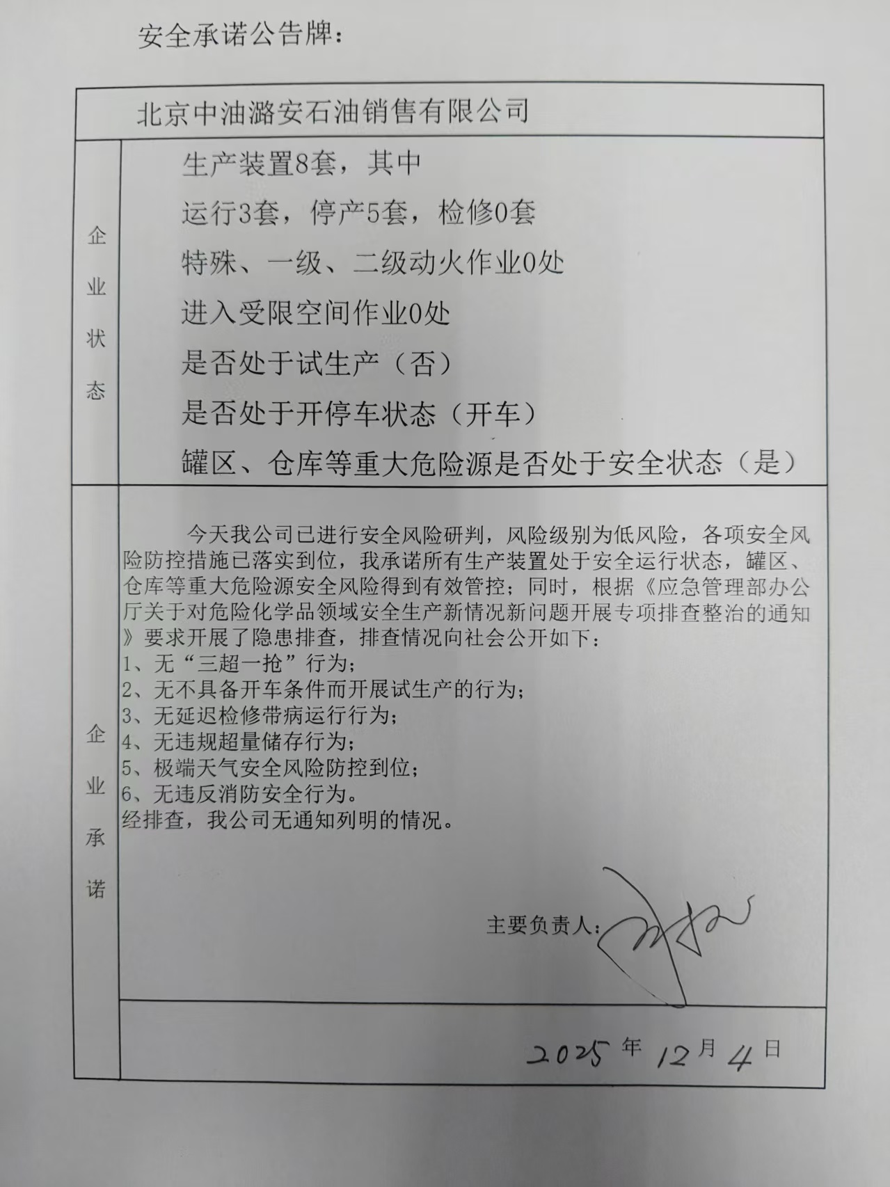 北京中油潞安石油销售有限公司安全承诺公告牌1204