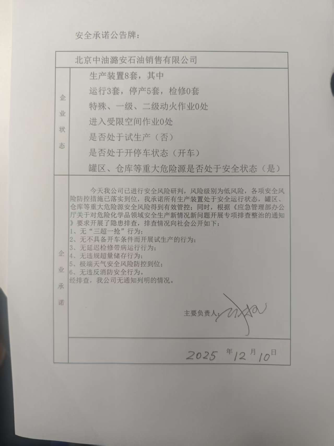 北京中油潞安石油销售有限公司安全承诺公告牌1210