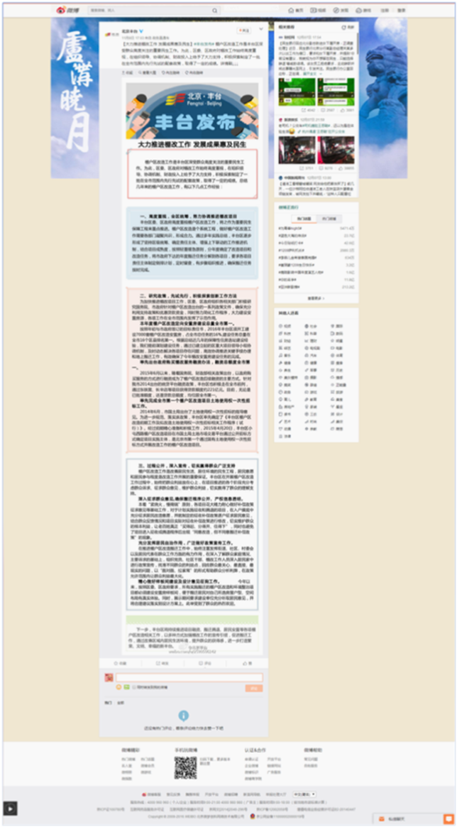 解读回应平台实现“权威发布、全媒融合”。我区积极推进主要负责人2016年解读重要政策措施工作。充分运用微平台进行政策解读、回应关切。做好“北京丰台”政务微博运维工作,“丰台发布”微话题实时发布相关政策及重大活动信息2100余条。例如2016年6月份,我区同市委宣传部、市环保局联合举办的“清洁空气在行动”丰台宣传报道活动,丰台区区长冀岩同志出席活动,并介绍了丰台区落实“清洁空气行动计划”工作进展、亮点和成效。一年来,区领导共召开8次新闻发布会,对我区整体发展规划、思路与举措以及其他重要政策进行解读,新京报、北京晚报、北京日报等媒体进行专题报道。