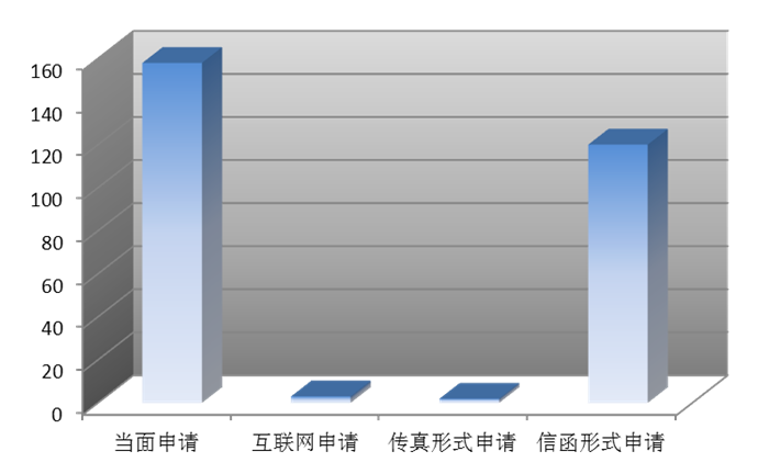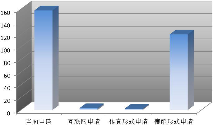 全区申请总数为283件。其中,当面申请158件,占总数的55.83%;通过互联网申请3件,占总数的1.06%;以传真形式申请2件,占总数的0.70%;以信函形式申请120件,占总数的42.40%。