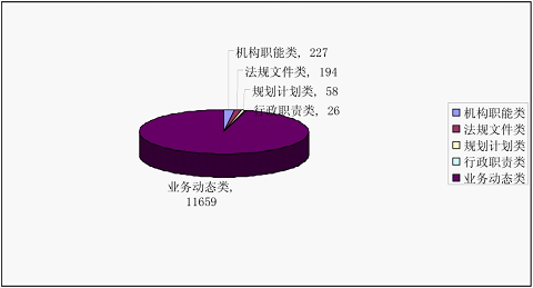 通过政府信息公开专栏主动公开政府信息12164条,全文电子化率为100%。其中,机构职能类信息227条,占总体的比例为1.87%;法规文件类信息194条,占总体的比例为1.59%;规划计划类信息58条,占总体的比例为0.48%;行政职责类信息26条,占总体的比例为0.21%;业务动态类信息11659条,占总体的比例为95.85%。