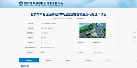 当前,我区PPP项目在财政部政府和社会资本合作中心网站上进行公开,主要公开PPP项目基本情况、政府及社会资本出资情况、合作模式、合作期限、咨询服务等信息。实现PPP项目信息公开,包括项目基本信息、政府采购资格预审公告、采购文件、确认谈判备忘录、预中标或成交结果、项目合同文本、中标或成交结果等信息。截止到目前,丰台区有3个项目在该信息平台公开,分别是:丰台区河西第三水厂项目、丰台区生活垃圾循环经济园餐厨厨余垃圾处理厂项目和丰台区生活垃圾循环经济园建筑垃圾资源化处理厂项目。