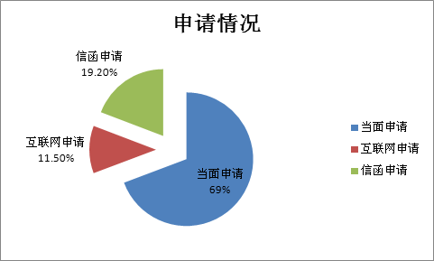 2017年全局申请总数为26件。其中,当面申请18件,占总数的69.2%;通过互联网申请3件,占总数的11.5%;以信函形式申请5件,占总数的19.2%。