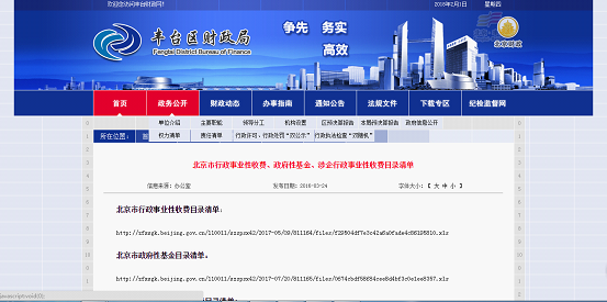 按照区政府政务公开要求,为深入推进收费清理改革,我局对外公布全区行政事业性收费目录清单。我区行政事业性收费和政府性基金目录及标准参照市财政局相应目录及标准执行,经与市局沟通,我局网站已与市财政局做链接,以达到及时更新,清理规范的目的。链接内容包括:北京市行政事业性收费目录清单、北京市政府性基金目录清单、北京市涉企行政事业性收费目录清单。