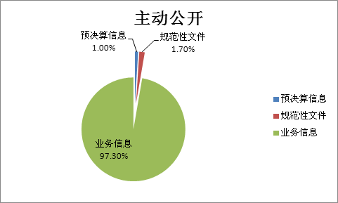 在主动公开的298条信息中,预决算类信息3条,占总体的比例为1%;规范性文件信息5条,占总体的比例为1.7%;业务动态类信息290条,占总体的比例为97.3%。