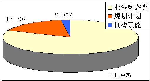 我局2009年共主动公开政府信息43条,其中全文电子化率达100%。在主动公开的信息中,机构职能类信息1条,占总体的比例为2.3%;规划计划类信息7条,占总体的比例为16.3%;业务动态类信息35条,占总体的比例为81.4%。