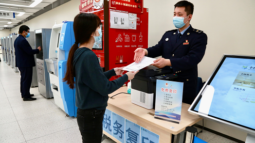 记者在四层扶梯西侧的税务复印区看到,群众在工作人员的指引下,拿着身份证、营业执照有序排队复印。税务工作人员说:“复印需求比较大,平均每天服务百余人,主要集中在营业执照、完税证明等。办事群众都反馈说不用下楼就能复印,很方便。”“在家还想着复印了再来呢,结果一出门就忘到脑后了,还好这里能帮我复印营业执照。”办事群众张女士拿到工作人员帮忙复印的营业执照喜上眉梢。