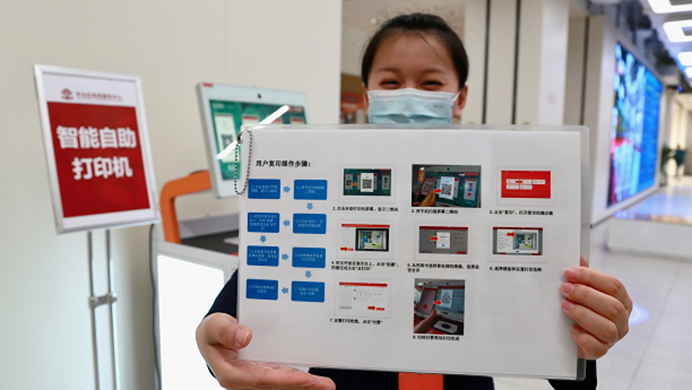 霍女士在工作人员的引导下用手机扫描二维码后点击屏幕上的复印服务,把房产本放置在平台上再点击拍摄键,勾选打印范围、设置复印份数,随即弹出缴费二维码,不到一分钟霍女士便拿到了复印件。