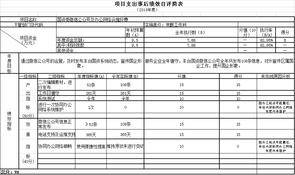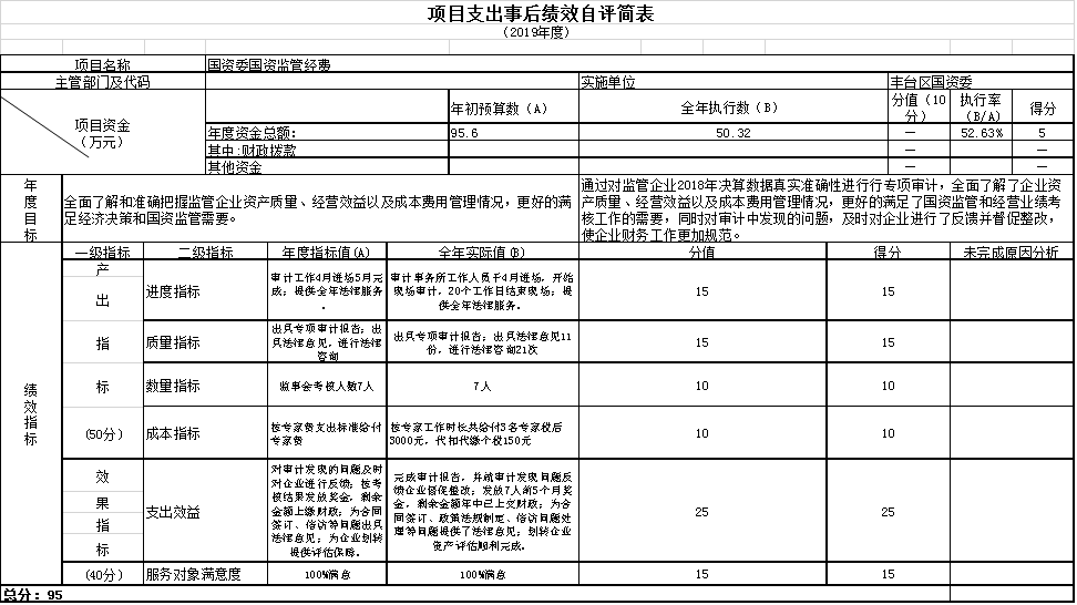 北京市丰台区人民政府国有资产监督管理委员会对2019年度部门项目支出实施绩效评价,评价项目7个,占部门项目总数的38.89%,涉及金额319.92万元。评价平均得分90.66分,总体评价结果较好。