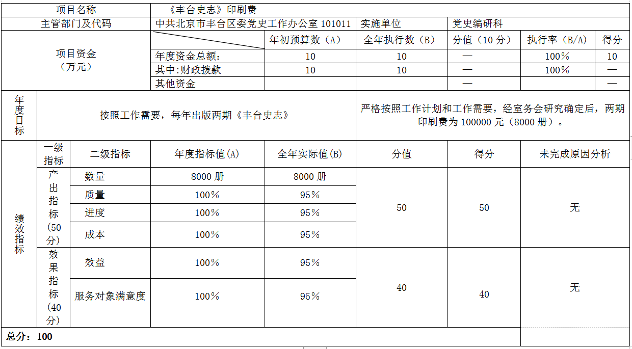 项目三、印刷《丰台史志期刊》:2019年预算批复数资金为10万元。实际支出金额为10万元,执行率为100%。总体评价得分为100分。
