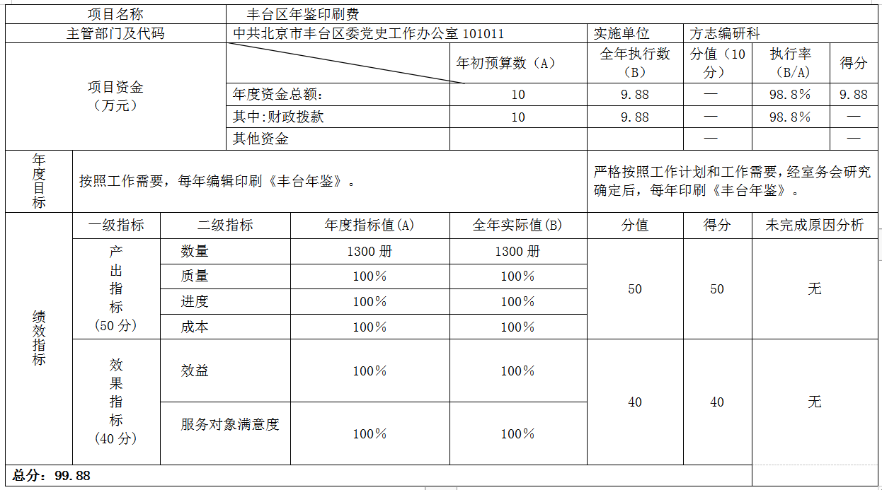 项目二、《2018年丰台年鉴》印刷费:2019年预算批复资金为10万元,实际执行支出金额为9.88万元,执行率为98.8%,总体评价为99.88分。