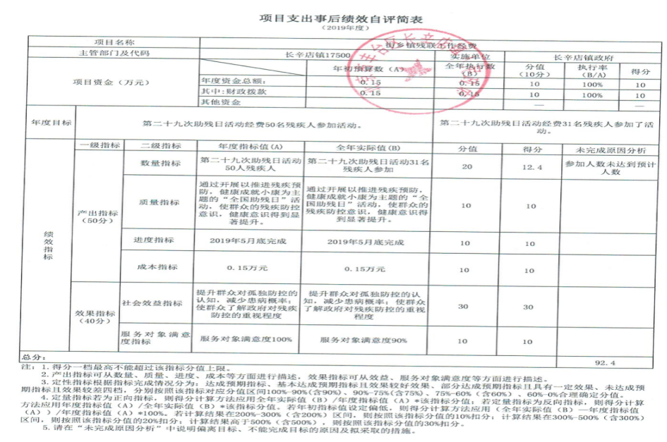 “残疾人事业”2019年度决算7.42万元,比2019年年初预算减少8.96万元,下降54.70%。主要原因:温馨家园经费、街乡镇残联工作经费、残疾儿童少年康复训练补助等项目未全部支出,年底收回指标。