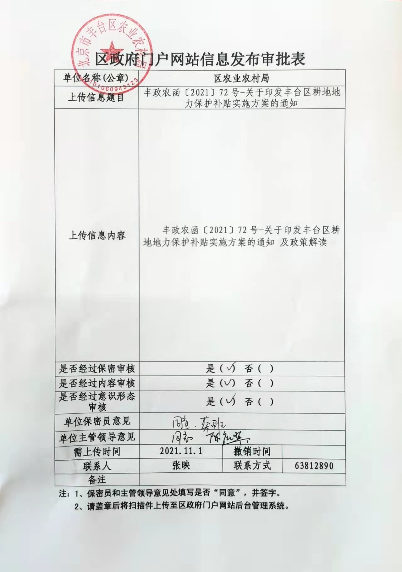 区农业农村部门逐镇(乡)核实申报资料无误后,导出并打印《北京市耕地地力保护补贴区级认可汇总表》,报区政府批准;区政府对上报的《北京市耕地地力保护补贴区级认可汇总表》批复同意后,由区农业农村部门将批复的《北京市耕地地力保护补贴区级认可汇总表》和批准数据报送市农业农村局。