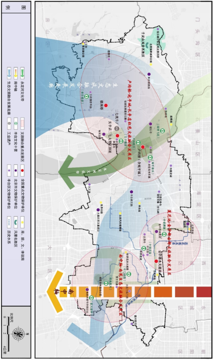 打造“文化十景”城市文化标识。结合分区规划提出的贯穿丰台东西的融合发展走廊,串联整合全区各级文物保护单位、历史建筑、遗址遗迹、工业遗产、公共文化设施、老字号、文化产业园区、旅游景区、城市公园、特色业态、特色活动等要素资源,以丰台区传统历史风貌与现代城市面貌,深入挖掘区域文化资源内涵,打造丰台“文化十景”。结合功能区、活力中心、治理类街道、疏整促、城市微更新等,分阶段围绕“文化十景”进行内容诠释、要素导入、载体提升、景观塑造和传播推介,提升城市形象和城市品质,增强城市活力和城市魅力,形成独具特色的城市文化空间,增加区域文化资源的多样性、可游性和认知力、传播力,丰富产品创新和高品质供给,打造区域特色鲜明的城市文化标识。