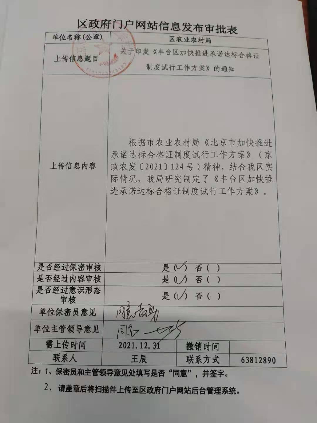 2019年,市农业农村局部署我市试行食用农产品合格证制度,我区积极推进试行工作,进一步压实了生产主体责任,促进了产管衔接,完善了农产品质量安全监管措施,取得了阶段性成效。近日,市农业农村局印发了《北京市加快推进承诺达标合格证制度试行工作方案》(京政农发〔2021〕124号),调整了合格证名称和样式,对合格证规范开具和监督管理等方面提出更高要求。为加快推进我区食用农产品承诺达标合格证制度试行工作,特制订本方案。
