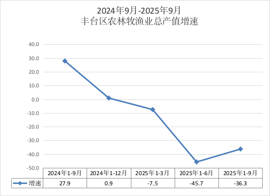 1-9月,丰台区实现农林牧渔业总产值6861万元,同比下降36.3%。其中,农业实现产值1440.5万元,同比下降11.3%;林业实现产值5333万元,同比下降41.1%;农林牧渔专业及辅助性活动实现产值87.6万元,同比持平。