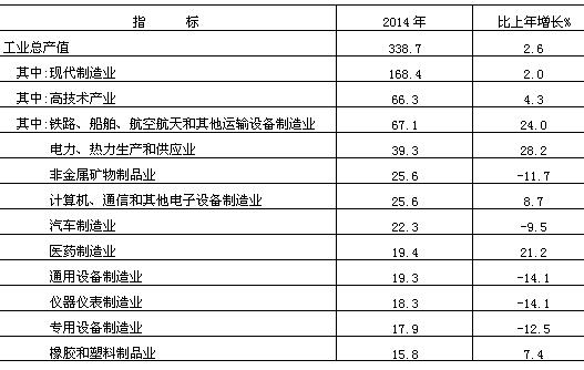 工业:全年规模以上工业实现工业总产值338.7亿元,比上年增长2.6%。其中现代制造业实现产值168.4亿元,增长2%;高技术产业实现产值66.3亿元,增长4.3%。从主要行业看,产值列前10位的行业有一半实现同比增长,其中铁路、船舶、航空航天和其他运输设备制造业,电力、热力生产和供应业,医药制造业分别增长24%、28.2%和21.2%。