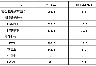 全年实现社会消费品零售额963.4亿元,比上年增长8.3%。在限额以上批发和零售企业中,汽车类实现零售额226.8亿元,下降10.1%;中西药品类实现零售额135.2亿元,增长17.3%;食品类实现零售额66.8亿元,下降3.1%;服装类实现零售额16亿元,下降43.7%。