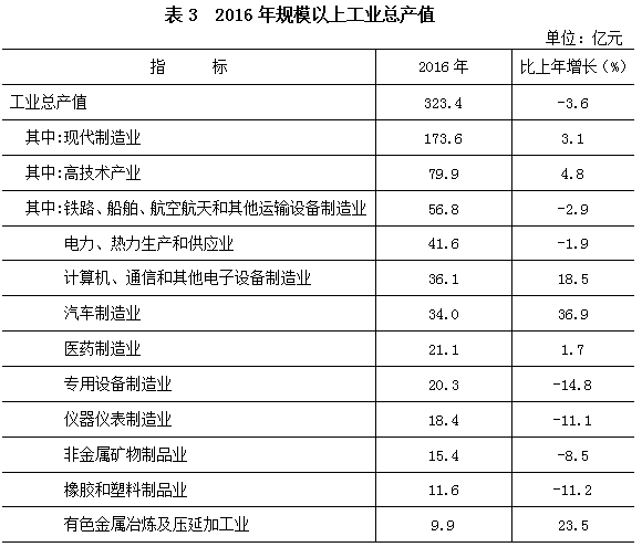 工业:全年规模以上工业企业实现工业总产值323.4亿元,比上年下降3.6%。其中,高技术产业实现产值79.9亿元,增长4.8%;现代制造业实现产值173.6亿元,增长3.1%。从主要行业看,产值列前十位的行业四升六降,其中计算机、通信和其他电子设备制造业,汽车制造业分别增长18.5%和36.9%,铁路、船舶、航空航天和其他运输设备制造业,电力、热力生产和供应业分别下降2.9%和1.9%。