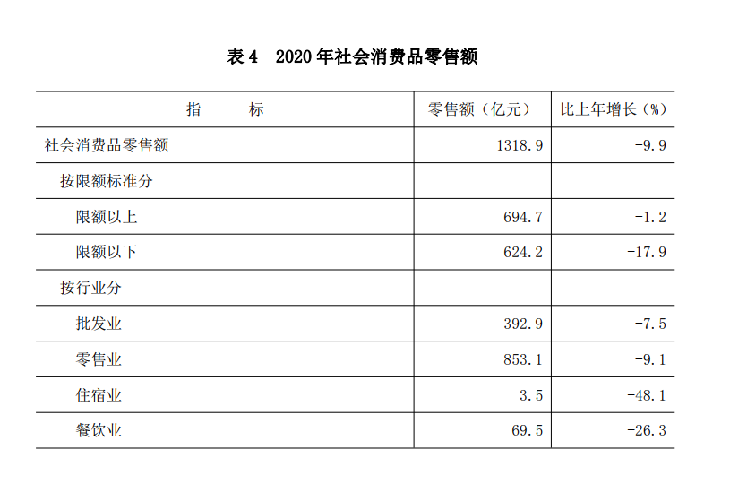 全年实现社会消费品零售额1318.9亿元,比上年下降9.9%。其中,实现网上零售额42.4亿元,增长32.5%。在限额以上批发和零售企业中,中西药品类实现零售额13.6亿元,比上年增长2%;汽车类实现零售额143.8亿元,下降23.1%。