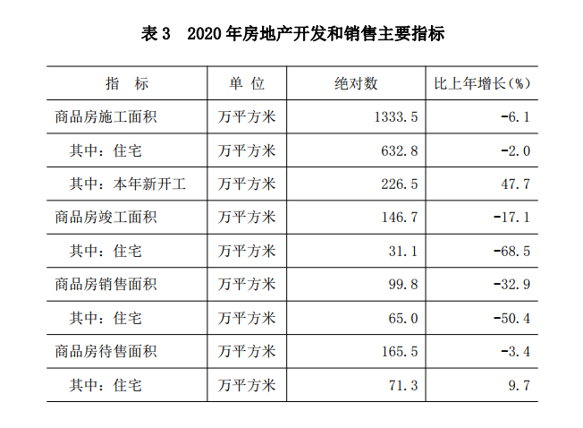 全区商品房施工面积1333.5万平方米,比上年下降6.1%。其中,本年新开工面积226.5万平方米,增长47.7%。全年商品房竣工面积146.7万平方米,下降17.1%。