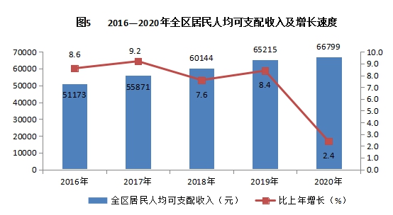 人民生活:全年全区居民人均可支配收入66799元,比上年增长2.4%。全区居民人均消费支出38472元,比上年下降11.5%;恩格尔系数为21.8%,比上年提高1.8个百分点。全区居民人均住房建筑面积29.75平方米。