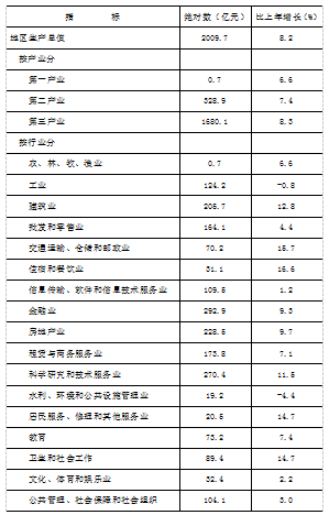 经济发展:初步核算,全年实现地区生产总值2009.7亿元,比上年增长8.2%。其中,第一产业增加值0.7亿元,增长6.6%;第二产业增加值328.9亿元,增长7.4%;第三产业增加值1680.1亿元,增长8.3%。三次产业结构为0.04:16.4:83.6。按常住人口计算,全区人均地区生产总值达到10万元,比上年增长11.3%。
