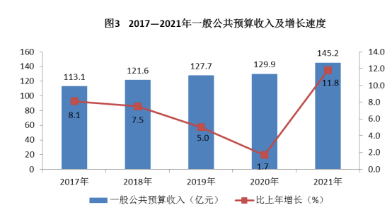 财政:全区完成一般公共预算收入145.2亿元,比上年增长11.8%。其中,增值税38.9亿元,增长10.3%;企业所得税23.2亿元,增长11.5%;房产税19.4亿元,增长15.8%;城市维护建设税8.7亿元,增长22.3%。一般公共预算支出262.8亿元,比上年下降6%。其中,用于节能环保、教育、卫生健康、科学技术的支出分别增长28.4%、15.3%、6.9%和6.5%。
