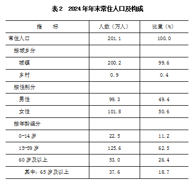 人口:年末全区常住人口201.1万人,与上年末持平。其中,常住外来人口62.3万人,比上年末减少0.4万人,占常住人口的比重为31%;城镇人口200.2万人,占常住人口的比重为99.6%。全区常住人口出生率为5.76‰,死亡率为6.92‰,自然增长率为-1.16‰。
