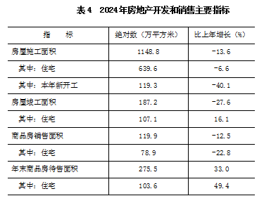 全区房屋施工面积1148.8万平方米,比上年下降13.6%。其中,本年新开工面积119.3万平方米,下降40.1%。全年房屋竣工面积187.2万平方米,下降27.6%。