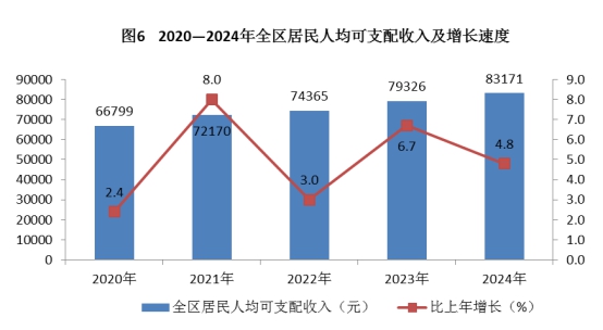 人民生活:全年全区居民人均可支配收入83171元,比上年增长4.8%。从收入构成看,人均工资性收入50983元,增长6.4%;人均经营净收入1224元,增长14.4%;人均财产净收入11147元,增长2%;人均转移净收入19817元,增长2.2%。