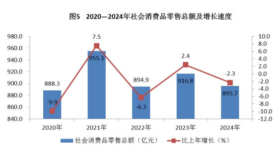 全年实现社会消费品零售总额895.7亿元,比上年下降2.3%。