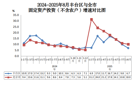 2024-2025年8月丰台区与全市固定资产投资(不含农户)增速对比图
