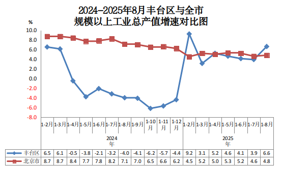 2024-2025年8月丰台区与全市规模以上工业总产值增速对比图
