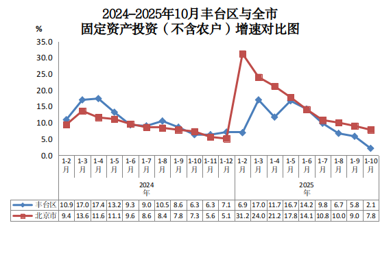 2024-2025年10月丰台区与全市固定资产投资(不含农户)增速对比图