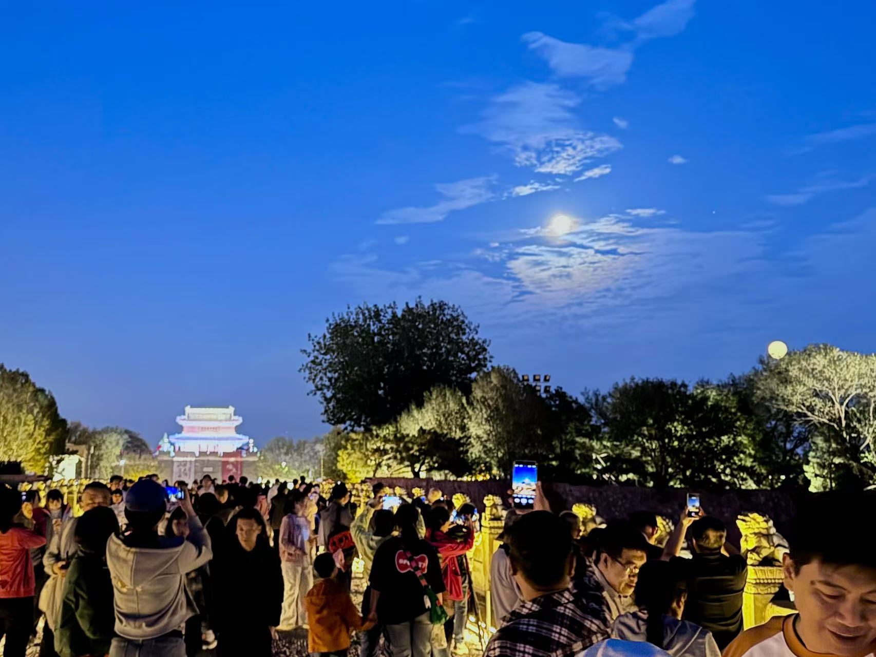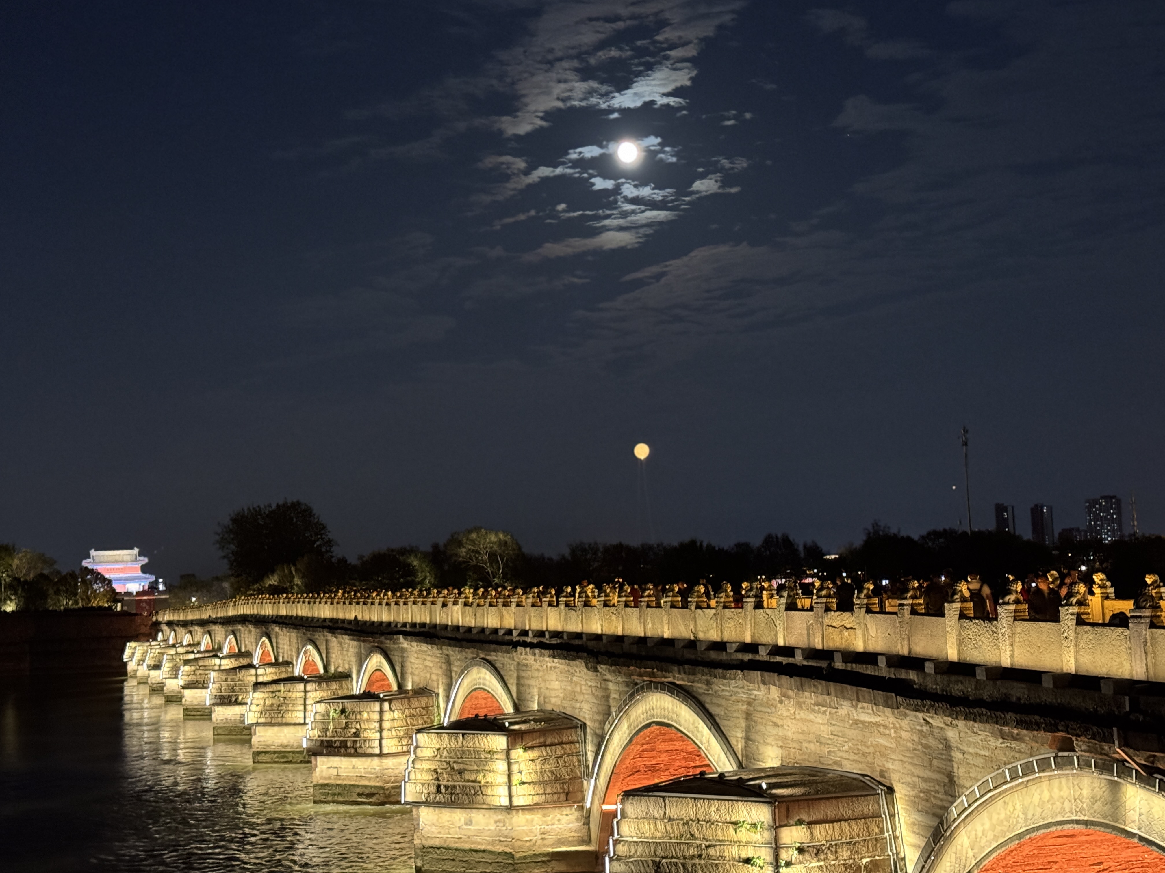 当燕京八景之一的“卢沟晓月”不仅出现在书中、画中,而是以实景形式再现,给历史的一封“诗意回信”便从宛平城内深情寄出。10月6日,宛平城迎来国庆中秋双节假期的高光时刻:直径5米的“光影月亮”从西南城墙缓缓升空,还原“卢沟晓月”古画意境;不远处,一轮圆月也从云层后探出头来,与这轮“人造月”在宛平城墙上空形成“双月同辉”的奇景。卢沟升月,月映卢沟,永定河畔“卢沟醒狮”巍然矗立,城墙上500面五星红旗迎风招展,与明月交相辉映,为市民游客打造出一场跨越古今的诗意盛宴。