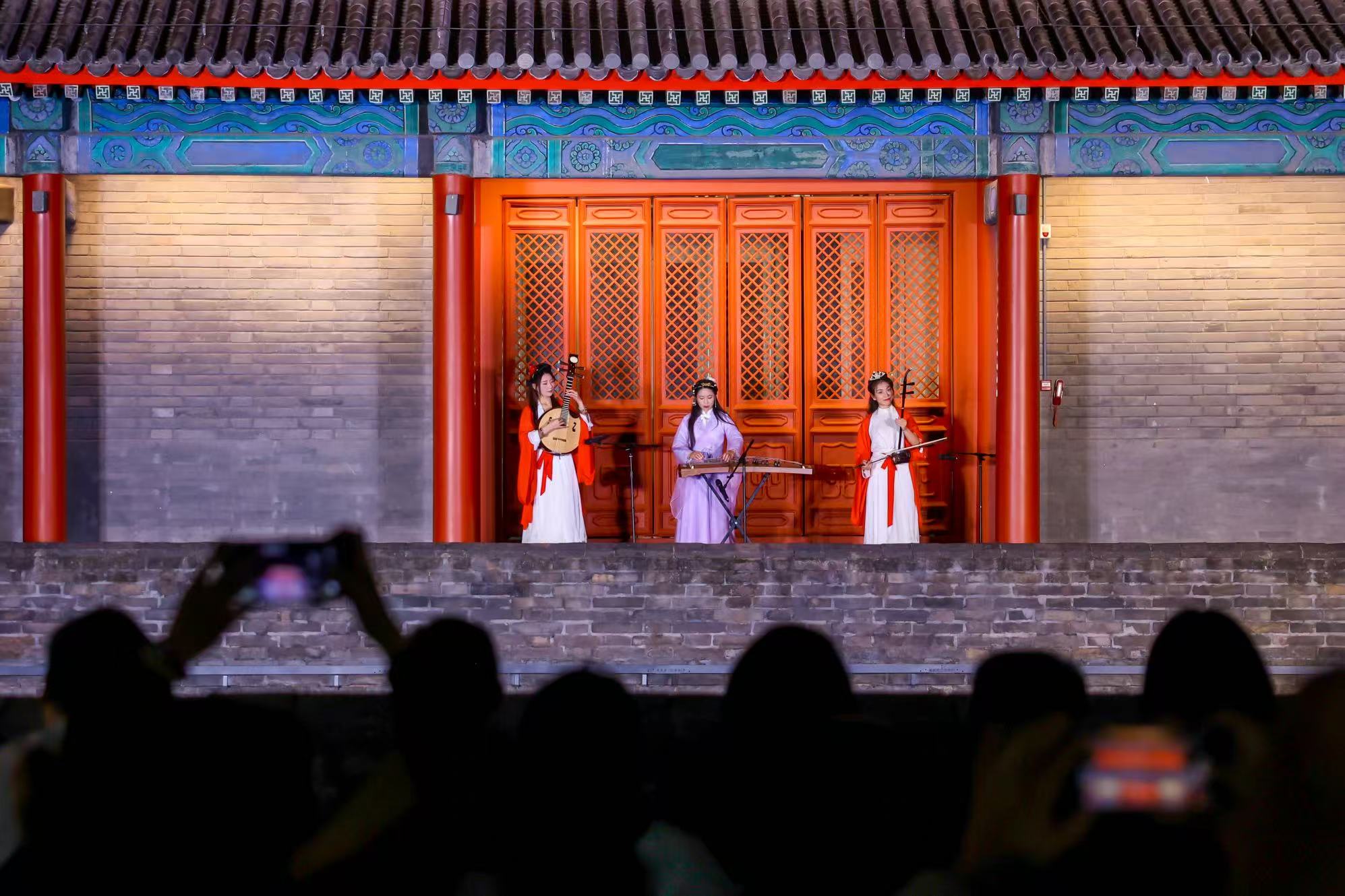 在宛平城墙上,西城楼成为傍晚至夜间的“艺术主场”。19时30分,“月满情浓·共话团圆”中秋表演如期开演,民乐《喜洋洋》《彩云追月》拉开序幕,快板《绕口令》、单弦《首都赞》《皓月当空》、京剧《贵妃醉酒》、北京琴书《长寿村》《礼尚往来》及相声《打灯谜》轮番登场,最后以手风琴小提琴合奏《我和我的祖国》点燃全场共鸣。20时15分,宛平戏楼推出免费儿童剧《遇见唐诗》,专业剧团演绎让孩子们在传统文化中感受诗意。