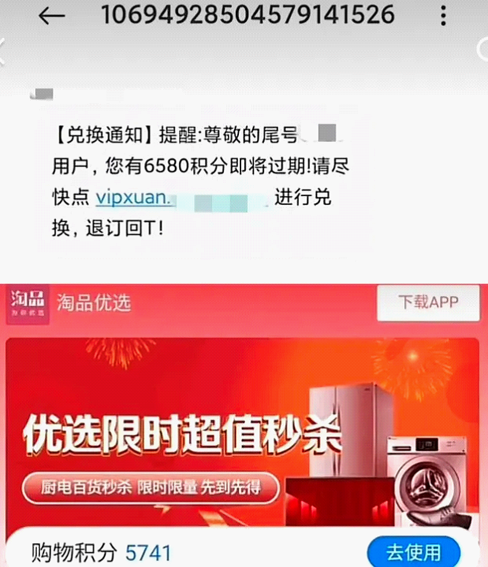 “迷迷糊糊接到短信,以为是移动积分到期了提醒兑换呢。”东北某地消费者王女士收到一条短信,说有6580积分即将过期。于是赶忙点击链接,以889积分和199元购买了一块夜光石英男表。一周后,王女士收到手表,发现质量非常低劣,且商家拒绝退货。她只好将其扔在一边,至今也未使用过。王女士的遭遇并非个例。广州消费者赖先生收到商家发来的短信后,使用积分并添加200多元购买了一款手表,商城还承诺酬宾赠送爱奇艺会员。然而付费后,既没有手表发货,更没有爱奇艺会员到账。记者调查发现,此类“积分兑换”短信的套路往往是“广撒网”——商家向海量人群发送带有链接的短信,利用消费者不忍积分过期的心理,诱导其购买劣质品。