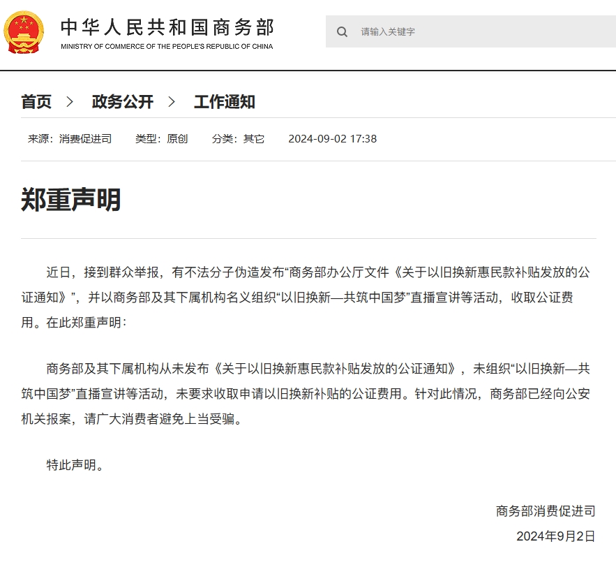 近日,有不法分子伪造发布“商务部办公厅文件《关于以旧换新惠民款补贴发放的公证通知》”,并以商务部及其下属机构的名义要求用户申请补贴机会,参与领取所谓以旧换新App、全民换新App公证补贴专项资金,或称组织“以旧换新——共筑中国梦”直播宣讲等活动,收取公证费、报名费等费用。