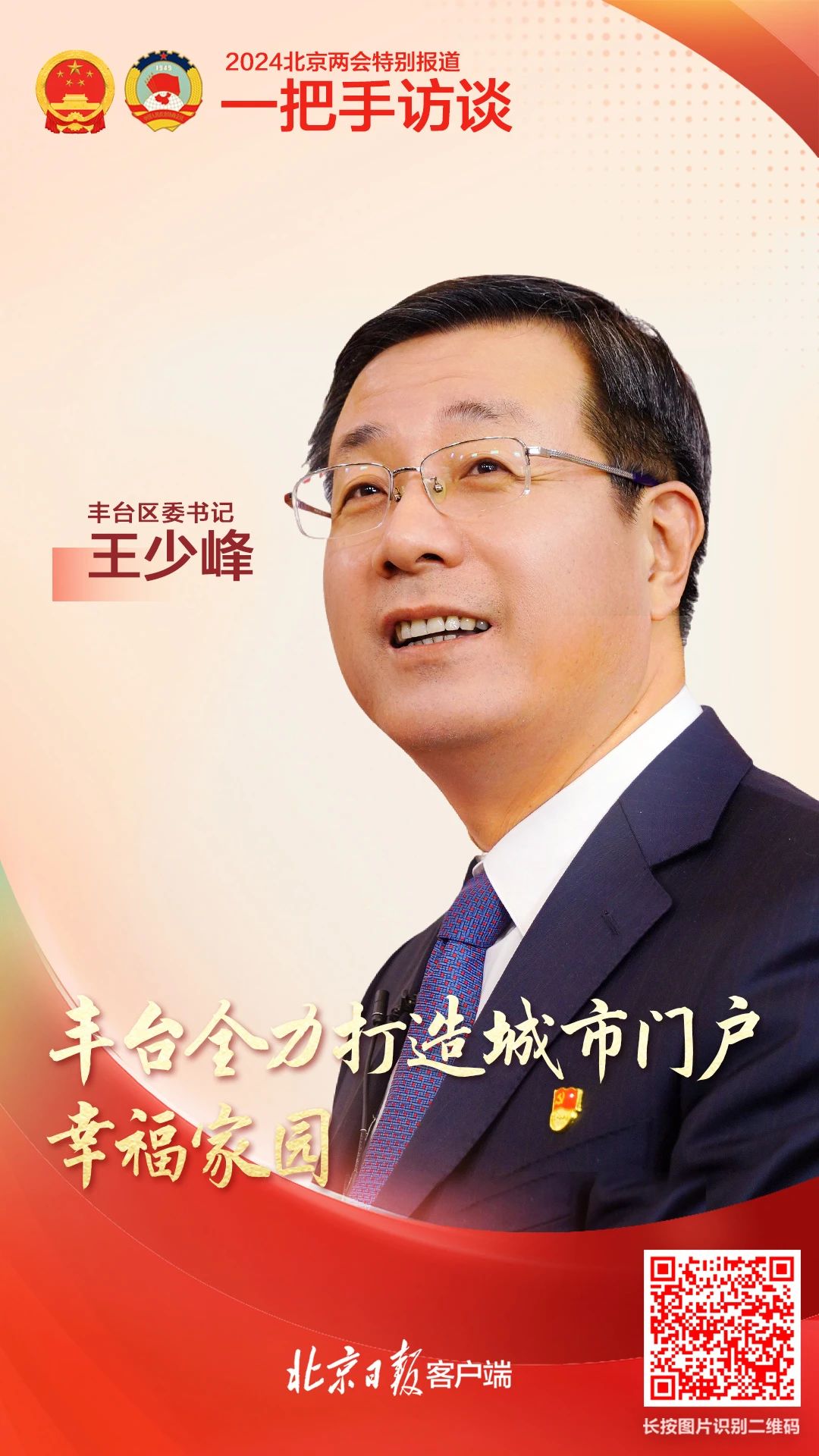 2024年北京市两会期间,市人大代表、丰台区委书记王少峰做客北京日报客户端“一把手访谈”节目,围绕南中轴地区建设提速、打造京津冀协同发展“桥头堡”、“教育强基工程”持续推进三个方面,介绍了丰台区2024年的新亮点。
