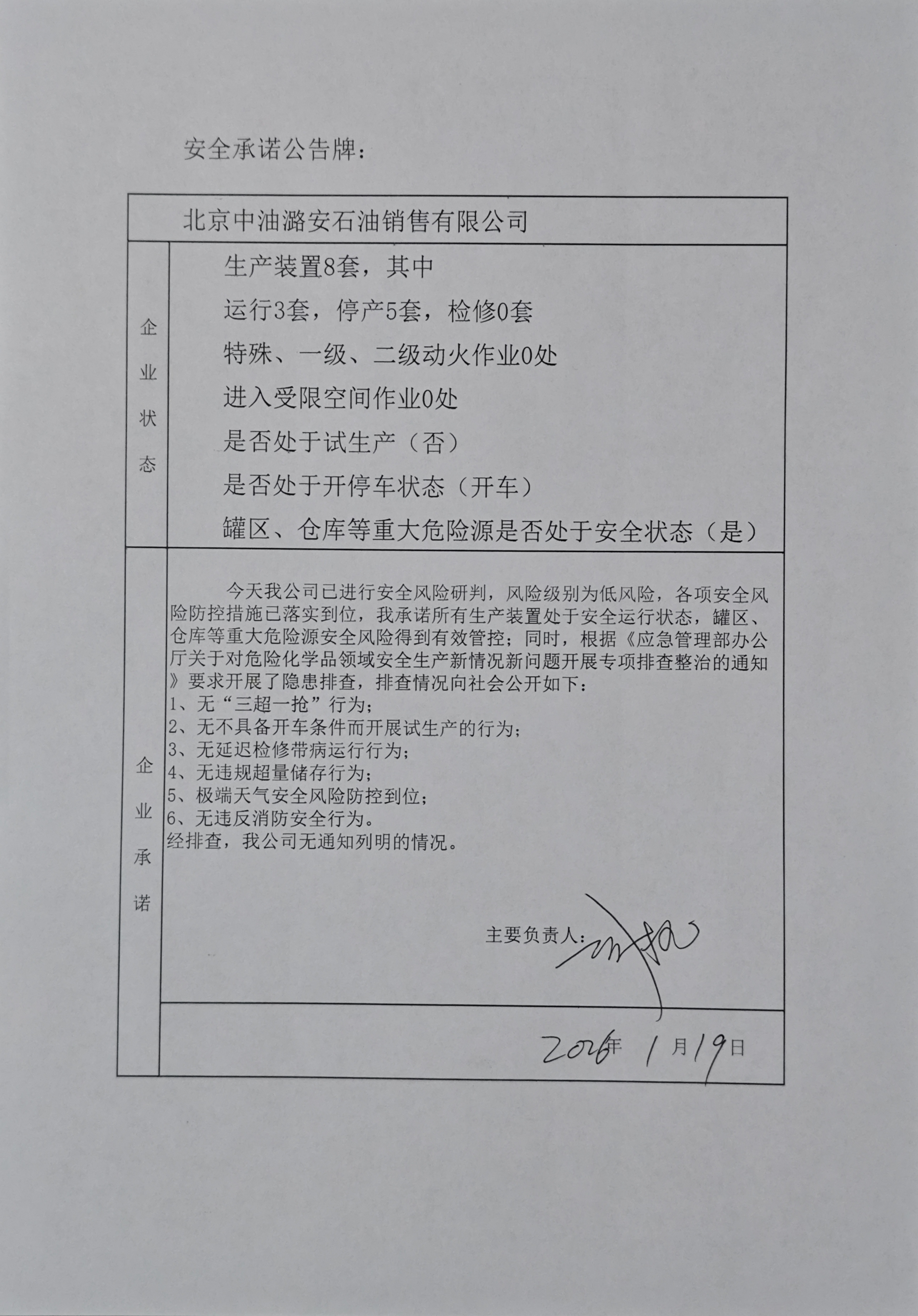 北京中油潞安石油销售有限公司安全承诺公告牌0119